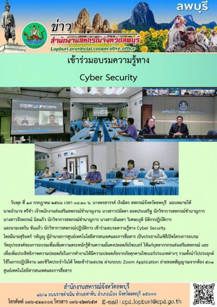 นางพรสวรรค์ เริงมิตร สหกรณ์จังหวัดลพบุรี มอบหมายให้นายอำนาจ ศรีขำ เจ้าพนักงานส่งเสริมสหกรณ์ชำนาญงาน นางสาวปนัดดา ยอดประเสริฐ นักวิชาการสหกรณ์ชำนาญการ นางสาวจีรพรรณ์ นิลแก้ว นักวิชาการสหกรณ์ชำนาญการ นางสาวธันยดา วิเศษะภูติ นิติกรปฏิบัติการ และนายเจตริน ขันแก้ว นักวิชาการสหกรณ์ปฏิบัติการ เข้าร่วมอบรมความรู้ทาง Cyber Security โดยมีนายสุรินทร์ วทัญญู ผู้อำนวยการศูนย์เทคโนโลยีสารสนเทศและการสื่อสาร เป็นประธานในพิธีเปิดโครงการอบรมวัตถุประสงค์ของการอบรมเพื่อเพิ่มความตระหนักรู้ด้านความมั่นคงปลอดภัยไซเบอร์ ให้แก่บุคลากรกรมส่งเสริมสหกรณ์ และเพื่อเพิ่มประสิทธิภาพความปลอดภัยในการทำงานให้มีความปลอดภัยจากภัยคุกคามไซเบอร์ประเภทต่างๆ รวมทั้งนำไปประยุกต์ใช้ในการปฏิบัติงาน และชีวิตประจำวันได้ โดยเข้าร่วมอบรม ผ่านระบบ Zoom Application ถ่ายทอดสัญญาณจากห้อง 501 ศูนย์เทคโนโลยีสารสนเทศและการสื่อสาร