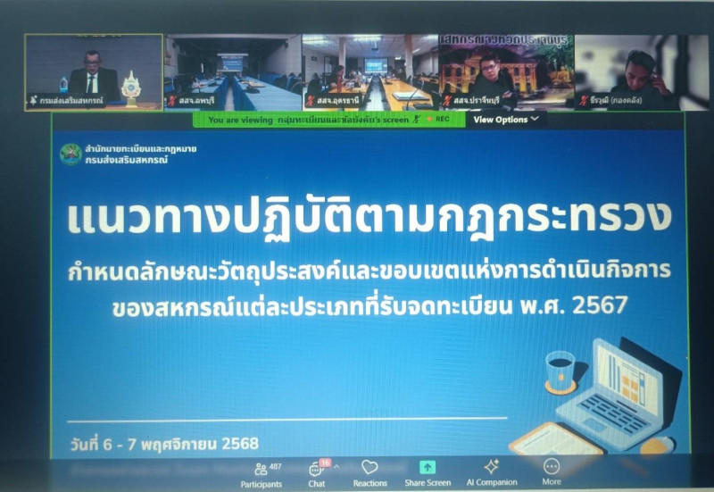 วันพฤหัสบดีที่ ๖ พฤศจิกายน ๒๕๖๘ เวลา ๐๙.๓๐ น. นายทินกร ตรีเวช สหกรณ์จังหวัดลพบุรี พร้อมด้วยบุคลากรสำนักงานสหกรณ์จังหวัดลพบุรี เข้าร่วมประชุมชี้แจงแนวทางปฏิบัติตามกฎกระทรวง กำหนดลักษณะ วัตถุประสงค์ และขอบเขตแห่งการดำเนินกิจการของสหกรณ์แต่ละประเภทที่จะรับจดทะเบียน พ.ศ. ๒๕๖๗ เพื่อซักซ้อมและชี้แจงแนวทางปฏิบัติให้เกิดความเข้าใจในการรับจดทะเบียนข้อบังคับให้เป็นไปในทิศทางเดียวกัน โดยมีนายประวัติ แดงบรรจง รองอธิบดีกรมส่งเสริมสหกรณ์ เป็นประธาน ถ่ายทอดผ่านระบบ Zoom Meeting จากกรมส่งเสริมสหกรณ์ ณ ห้องประชุมสำนักงานสหกรณ์จังหวัดลพบุรี อำเภอเมืองลพบุรี จังหวัดลพบุรี